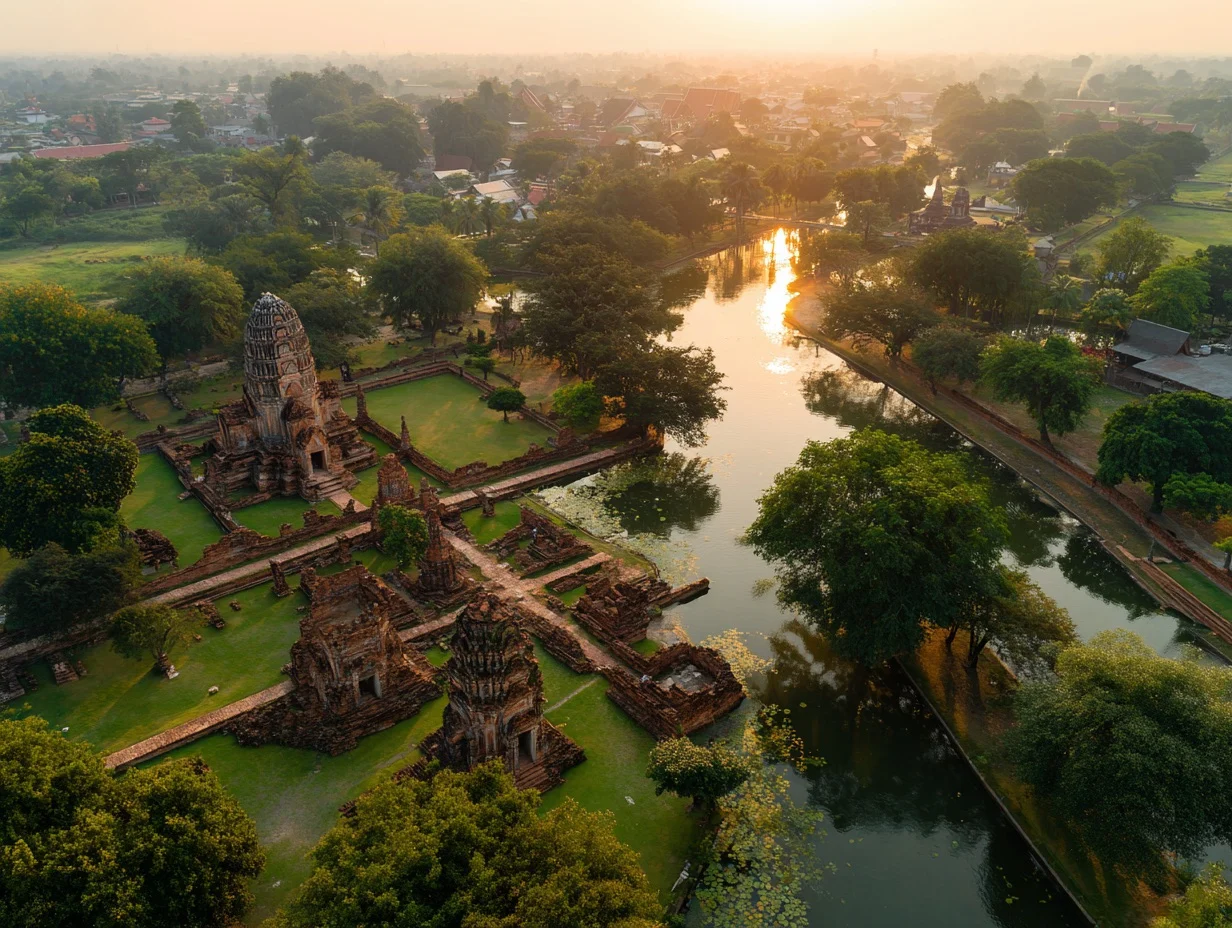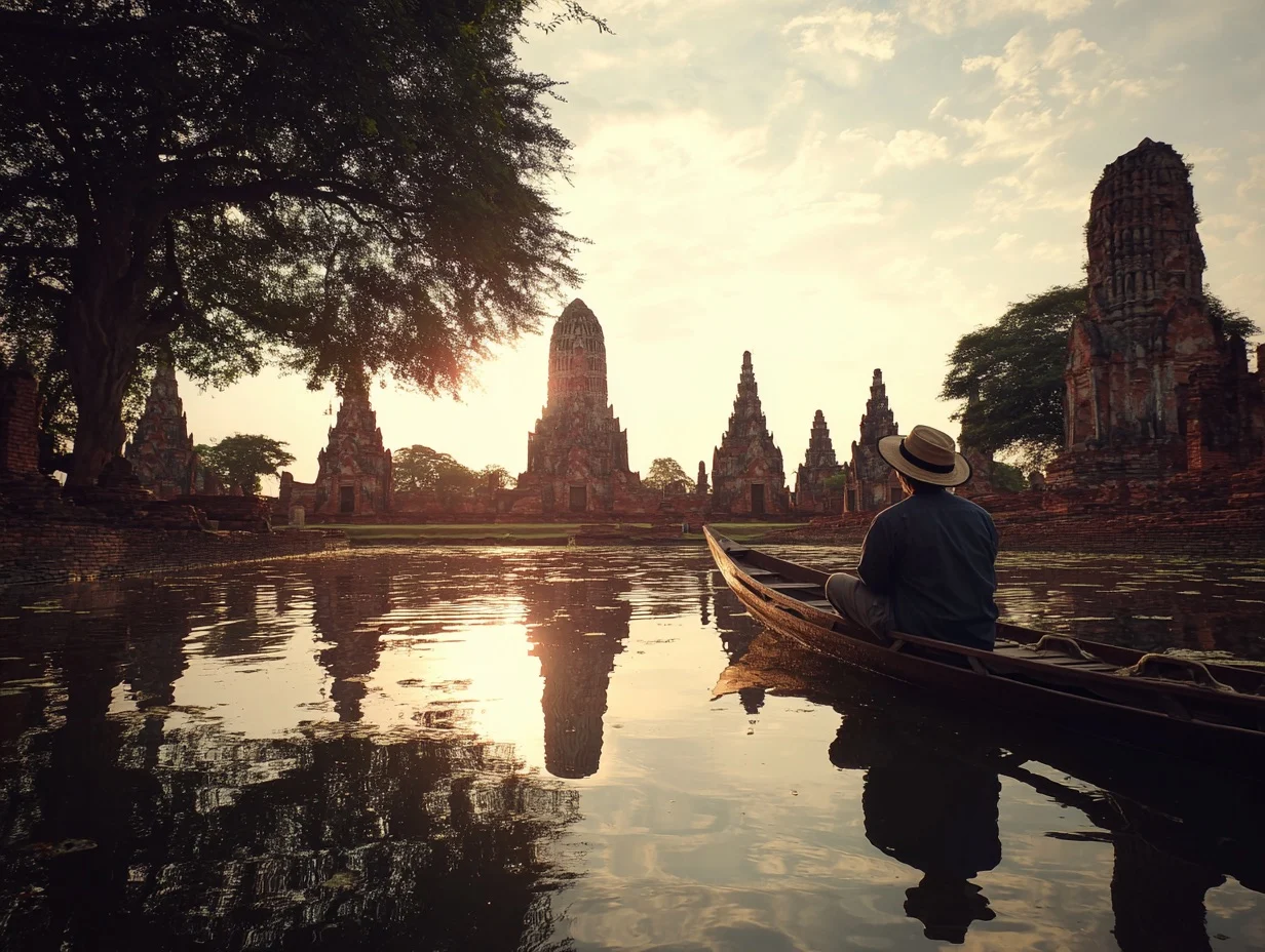 Vom Wasser aus siehst du Ayutthaya noch mal anders – ruhig, reflektierend, goldgetaucht.